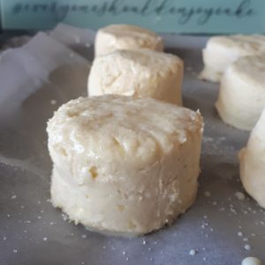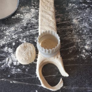 - With LIGHTLY floured hands pull the dough together GENTLY until you can form a long rectangle the width of your 5cm (2in ) cutter and 3cm (3/4in for you old fashioned type šš)in height and 27 cm long . You will get 5 out of this process