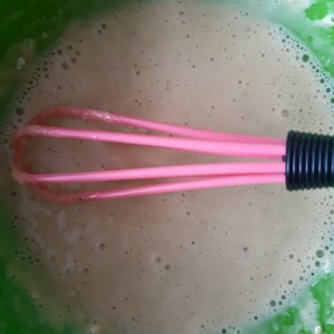 4. Add the milk. maple syrup and the chickpea slurry to the dry ingredients and with a metal whisk whisk until lump free and smooth