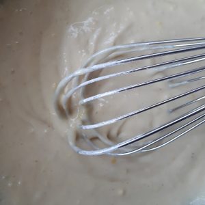 4. Add the milk. maple syrup and the chickpea slurry to the dry ingredients and with a metal whisk whisk until lump free and smooth
