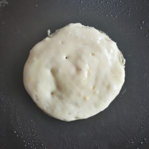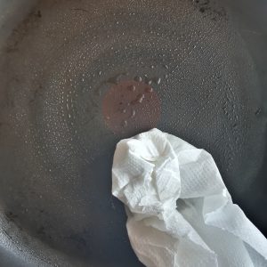 6. Using a piece of kitchen roll wipe the pan with oil so just a light covering , you will need to do this after every set of pancakes made