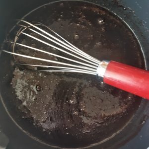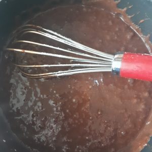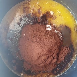 - Add the cocoa and sugar and whisk until fully combined and take off the heat
