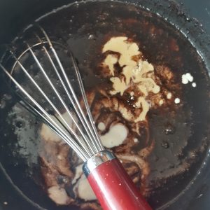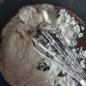 - Add the flour mix to the pan and whisk until smooth