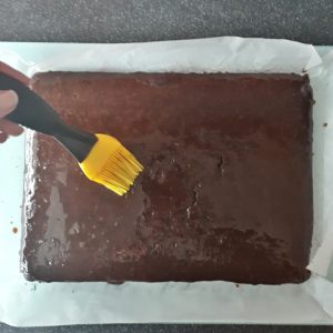 - Brush the top of the cooled cake with a layer of coffee syrup