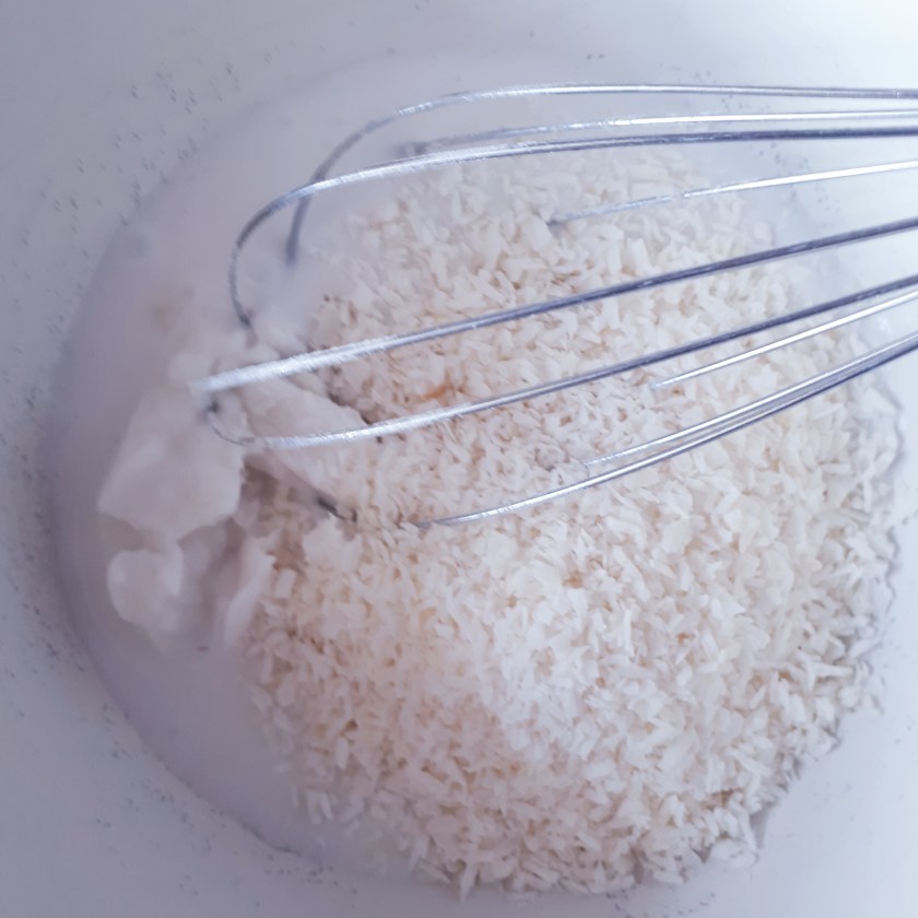 - Add The desiccated coconut to the the coconut milk, coconut extract / flavouring and add to the batter . Turn the speed up to medium-high and mix until everything is light, smooth and well combined.