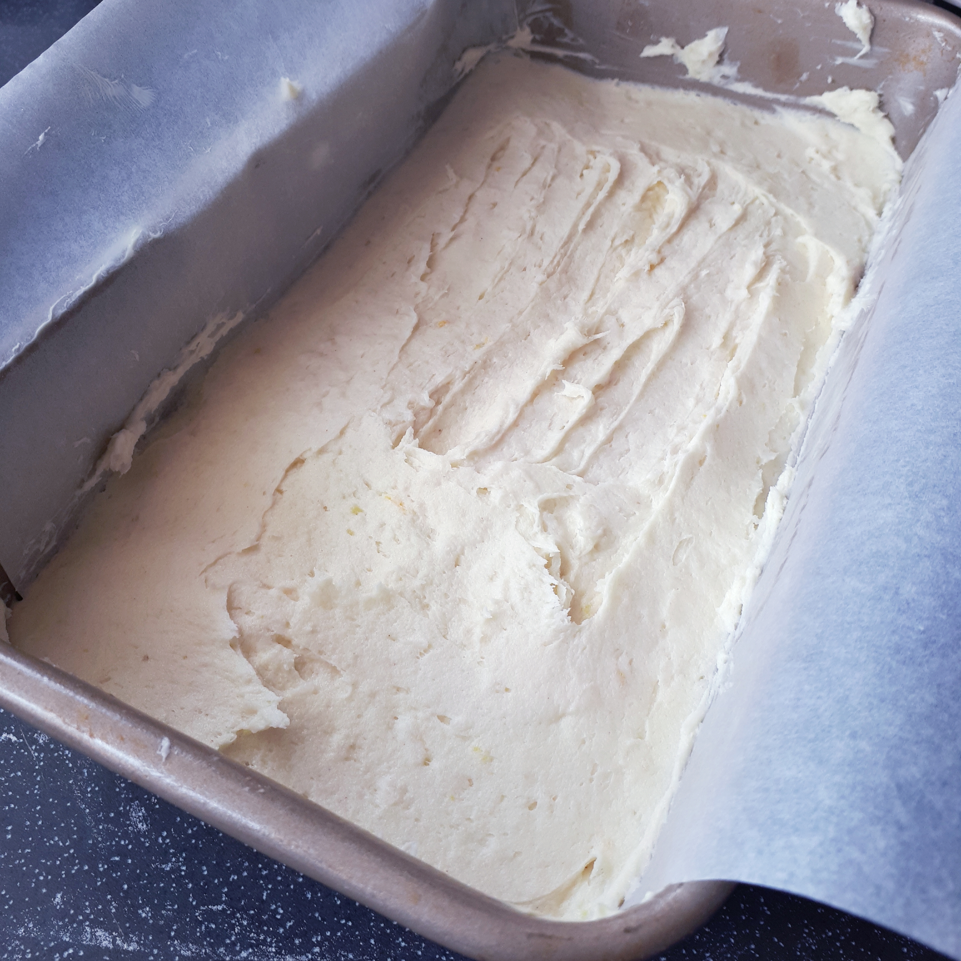 - Spoon the batter into your prepared loaf cake and spread into an even layer. Place in the oven for 50 minutes minutes, until risen, golden and an inserted cocktail stick or cake tester into the centre comes out clean.