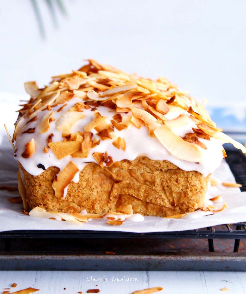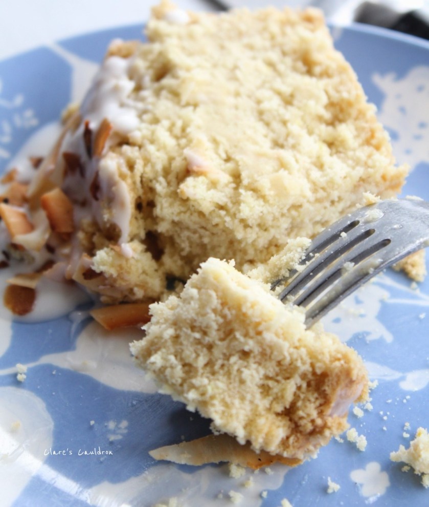 The combination of soft cake textured with desiccated coconut and topped with toasted coconut flakes adds the right amount of coconut in my book