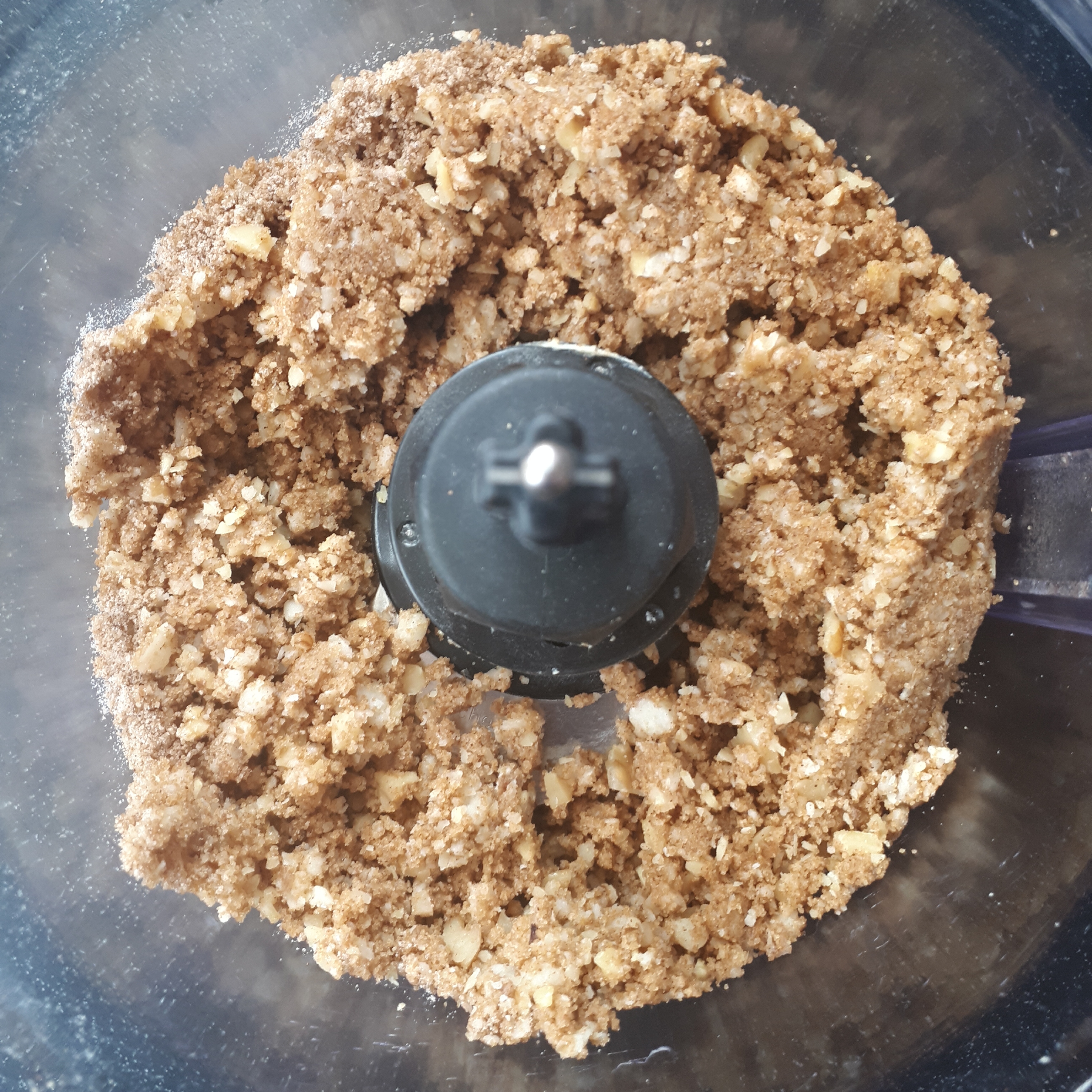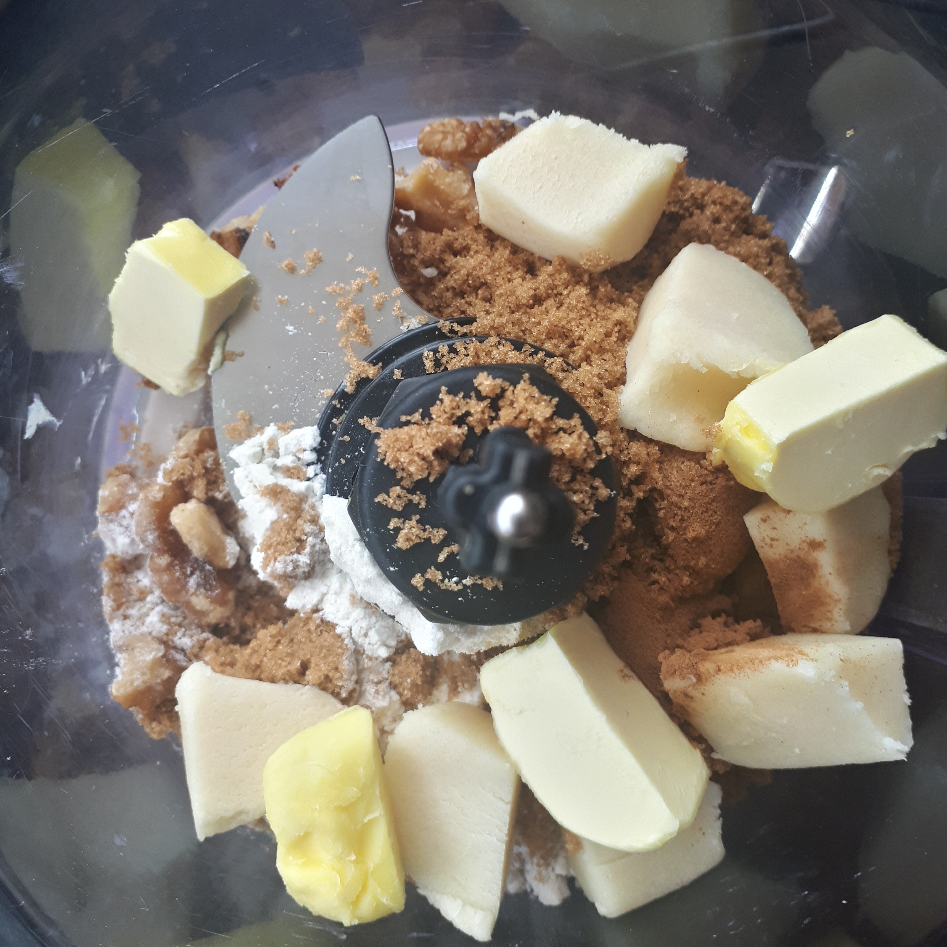 3. Make the topping of the cake by putting all the topping ingredients listed in the ‘ Ingredients topping ‘ section above into the bowl of a food processor and pulse until the mixture looks like gravel , do not go any further or the mixture will turn to paste . Set to one side