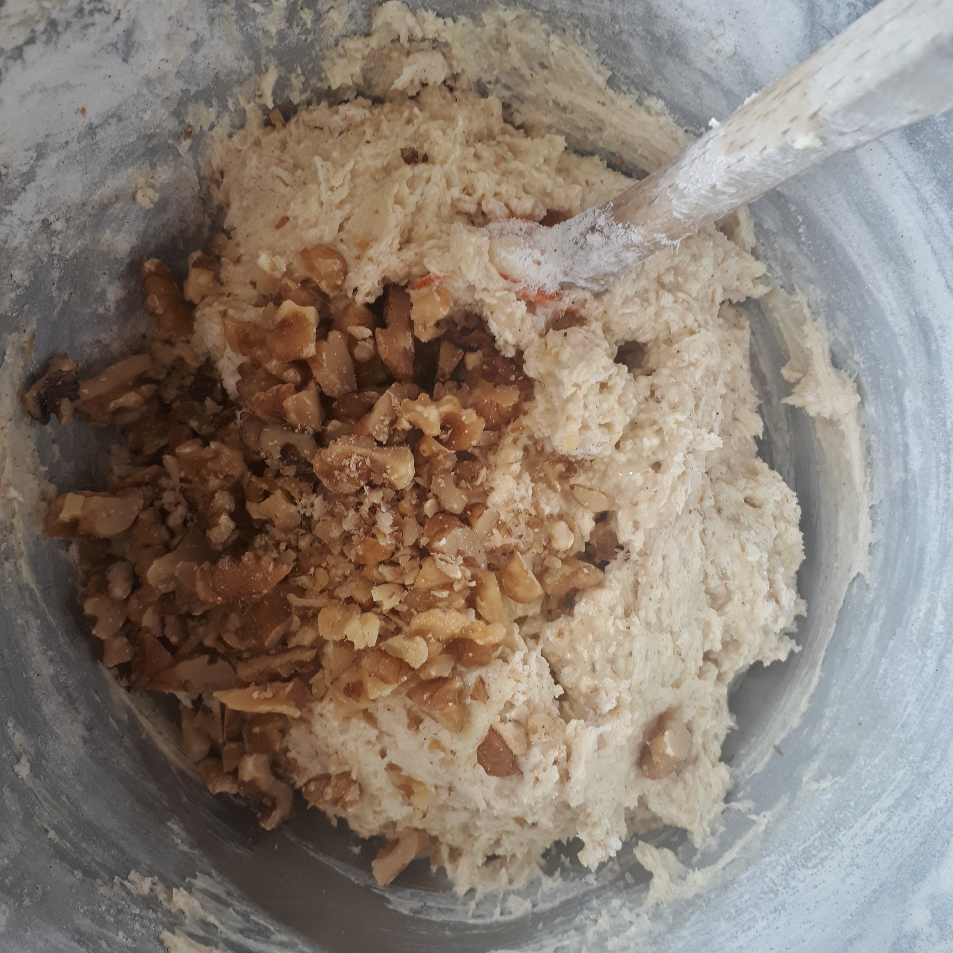 10. Then in 3 equal parts mixing on low ( or folding in with a spatula by hand ) mix the flour into the wet mixture until just combined , add the walnuts the mixture will be thick