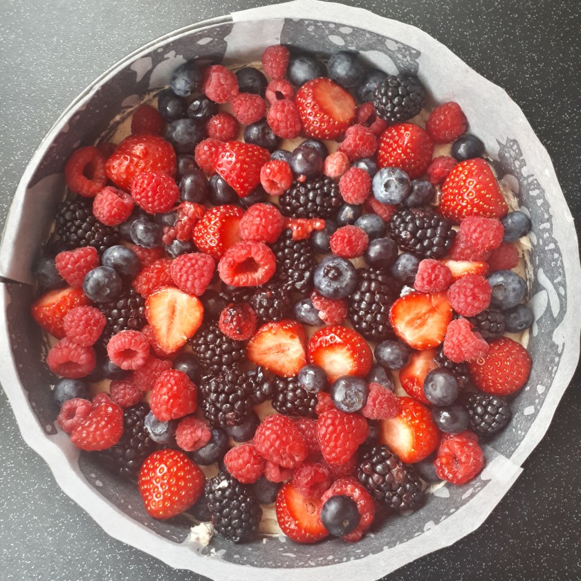 23 cm ( 9′ ) springform tin is required . This recipe has only been made using fresh fruit I cannot comment in the use of frozen fruit and its results