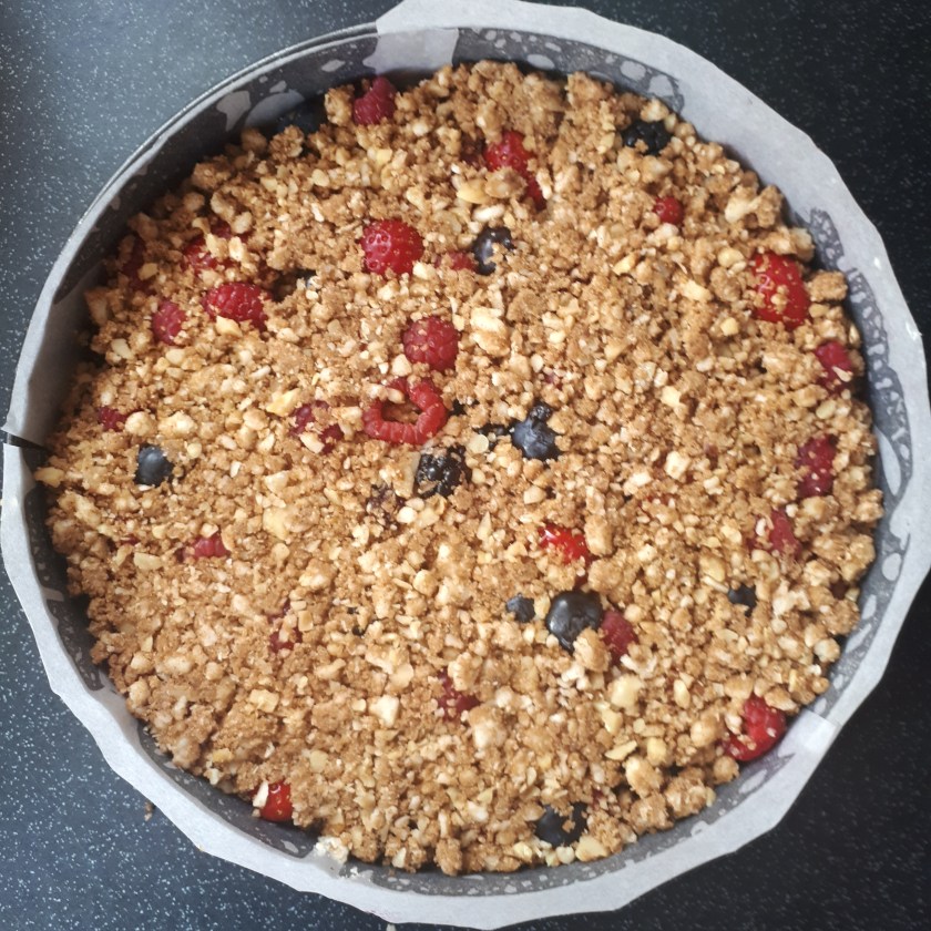 14. Bake in the oven on the middle shelf for 1 hour and 15 minutes until the topping is golden brown and the berry juices are bubbling through