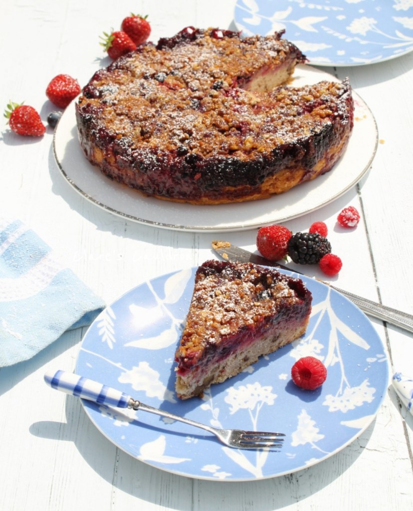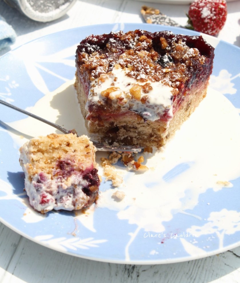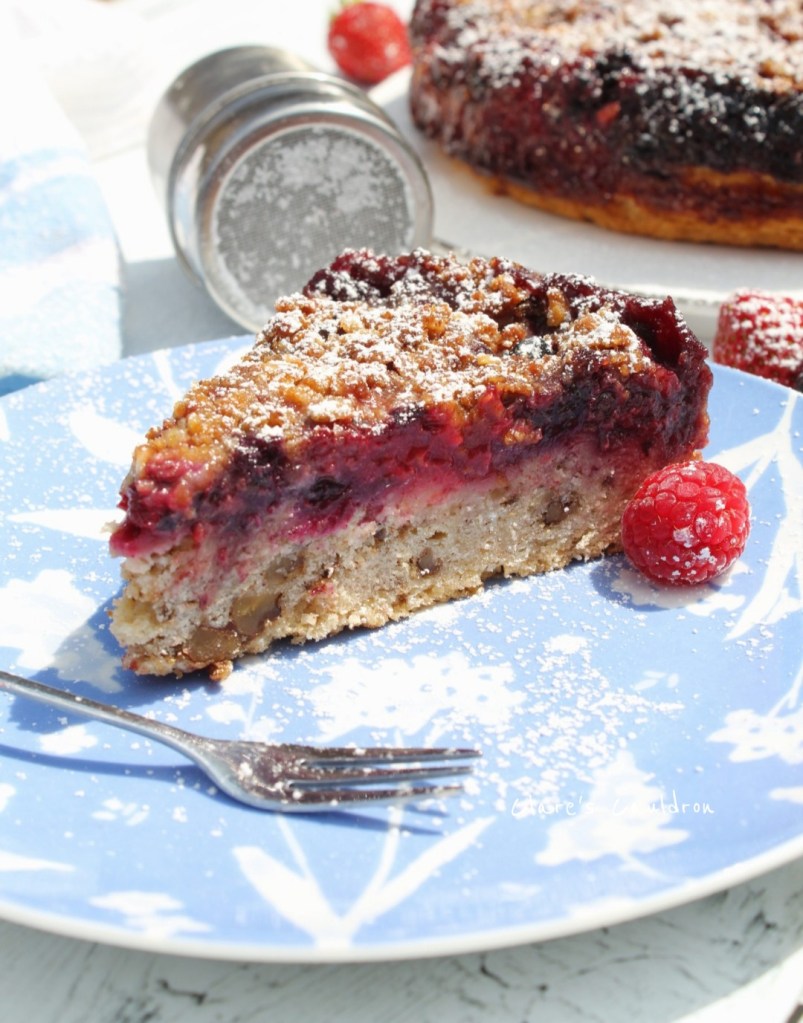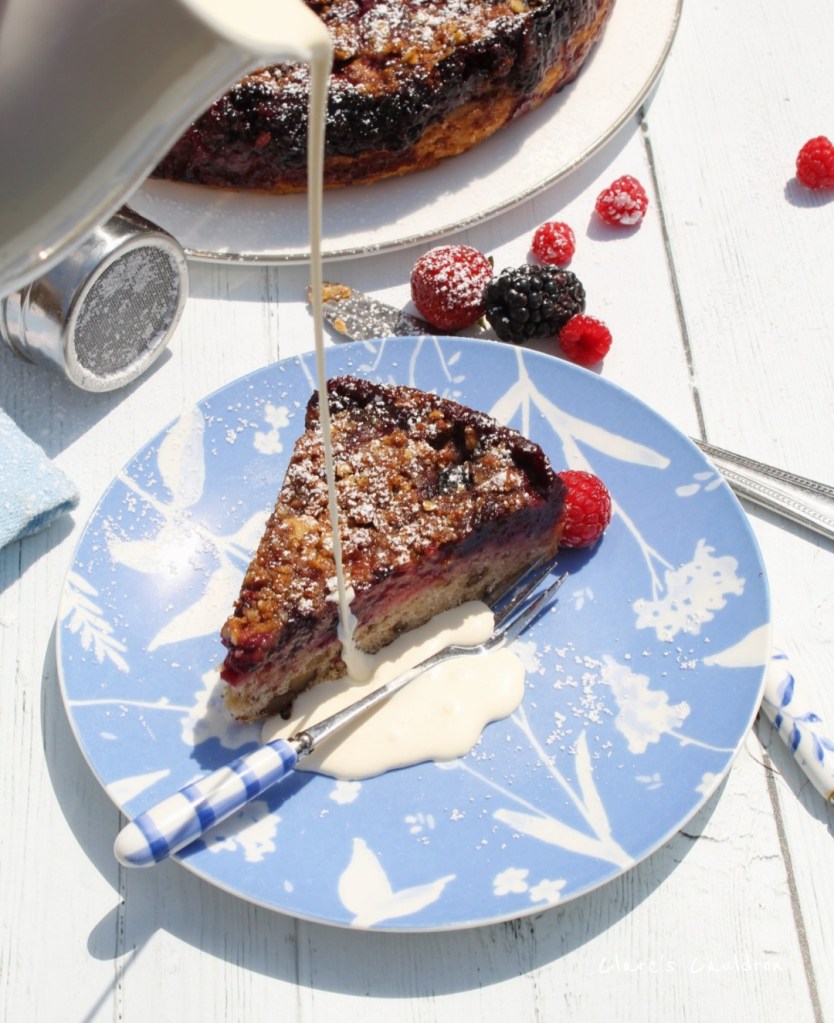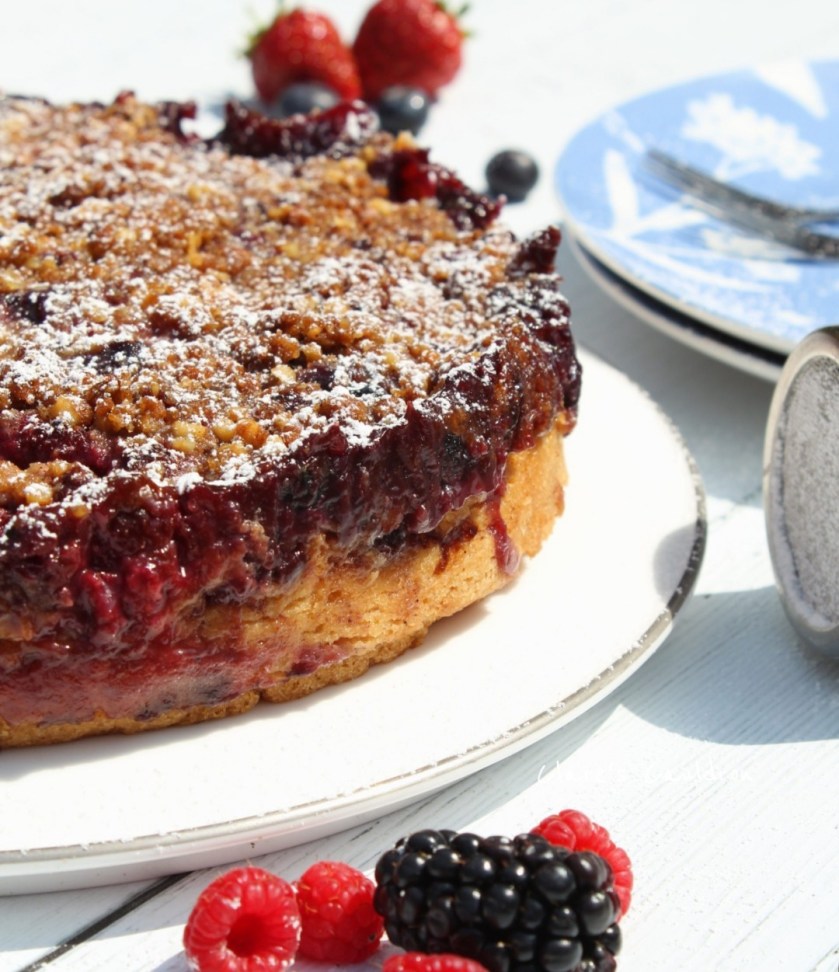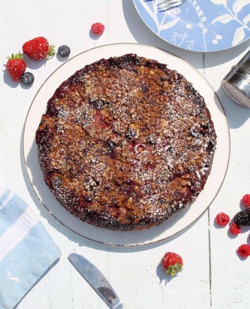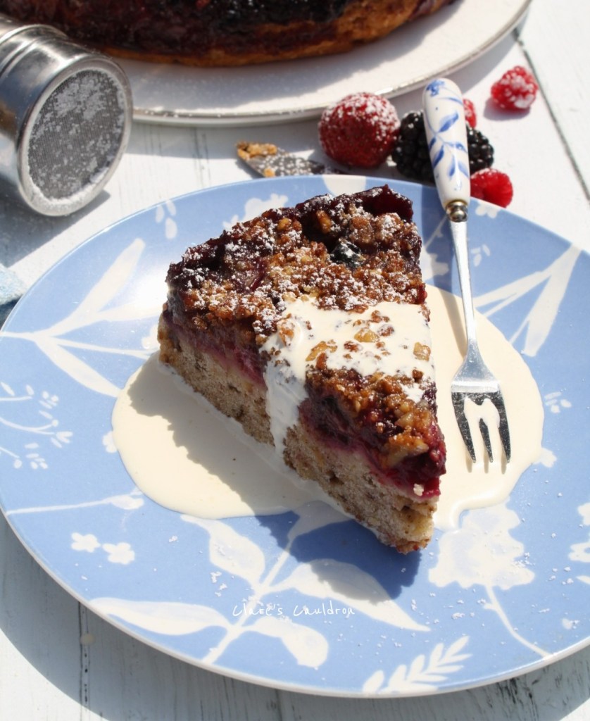 A walnut sponge topped with a medley of jammy seasonal fruits and nut topping