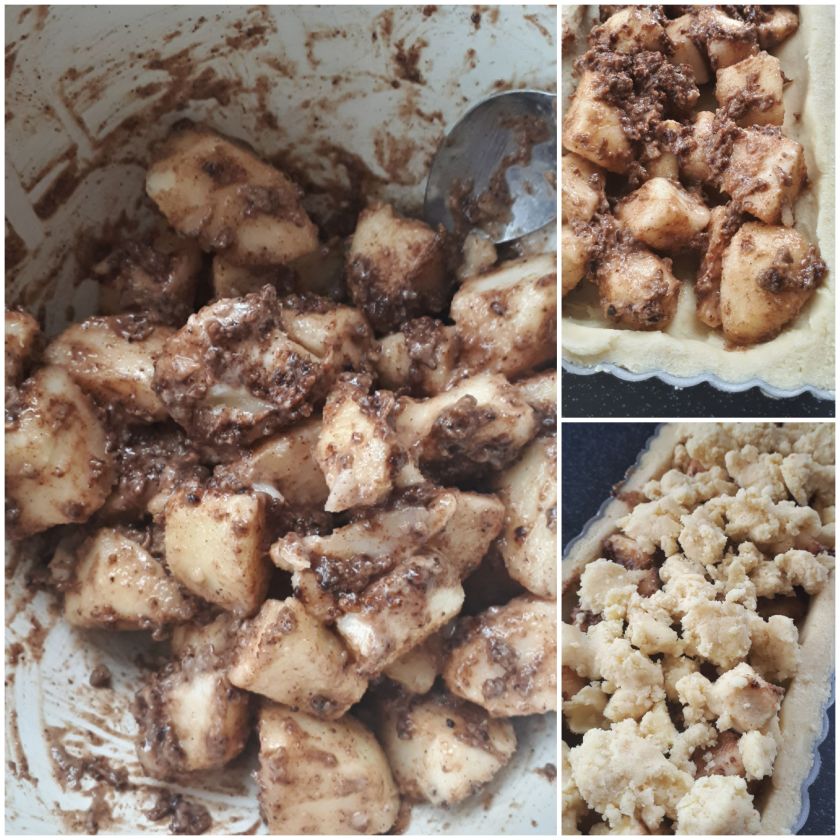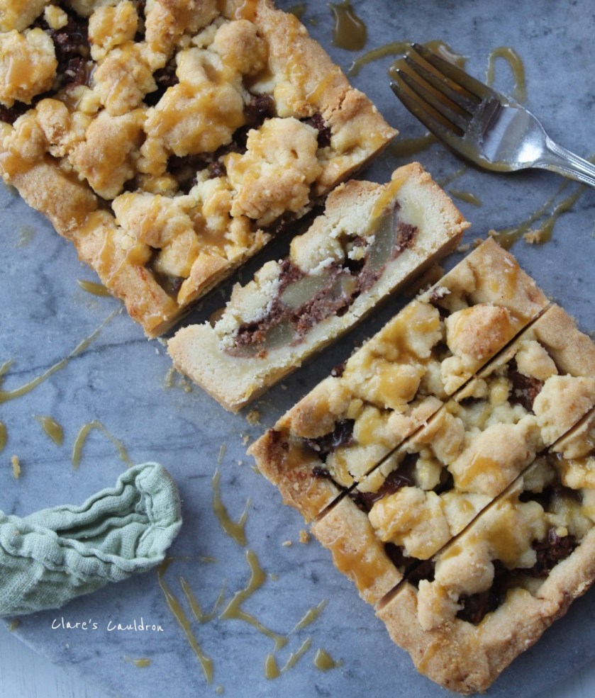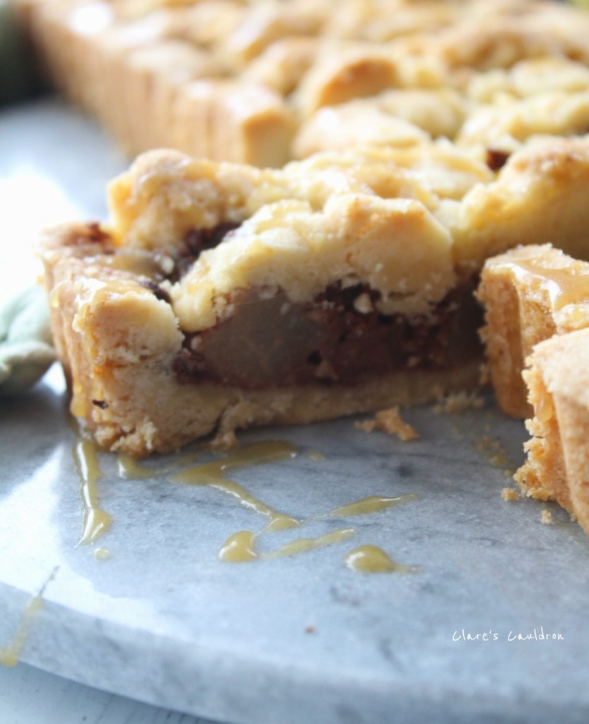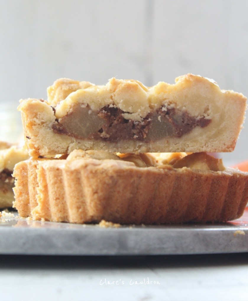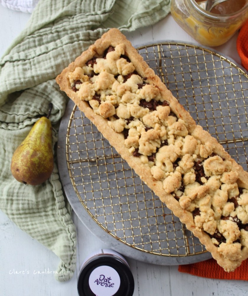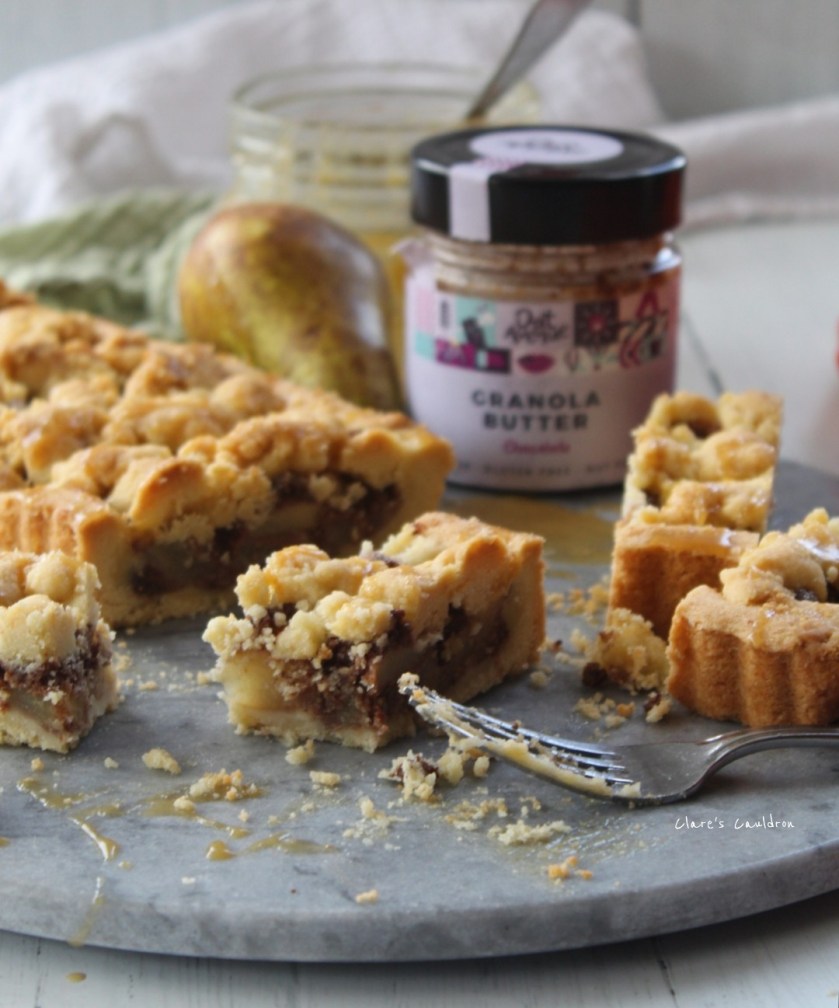 Juicy Pears and Chocolate Granola Butter Encased in a Crumble Tart