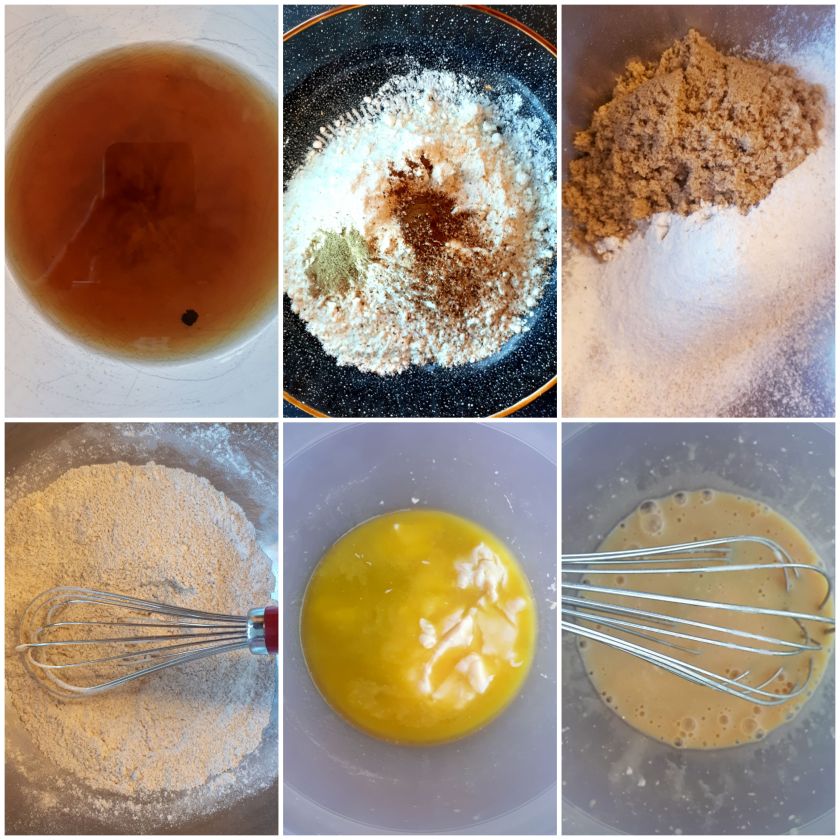 3. Mix the Flour, baking powder , baking soda Xanthan, ( if using )and spices with a whisk in a medium sized bowl until fully mixed
