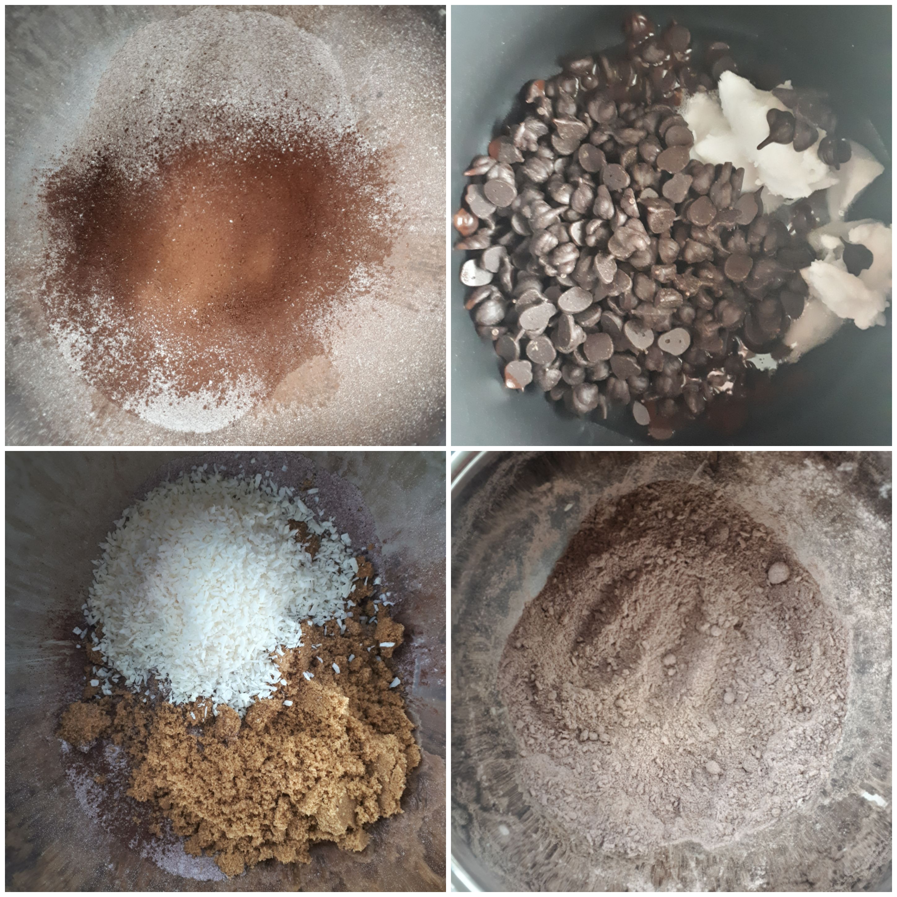 - Pour in the melted chocolate mixture and the coconut milk. to the dry ingredients