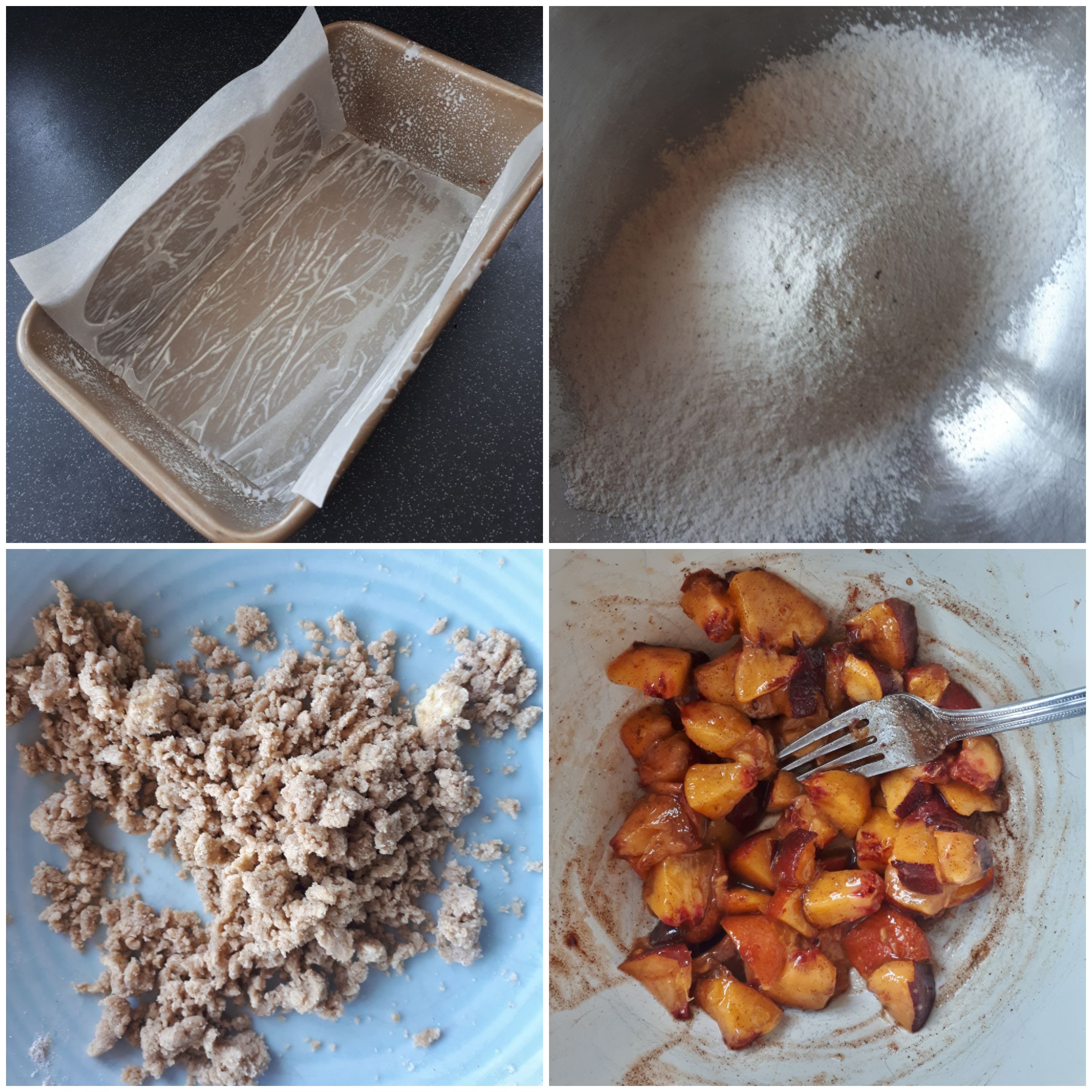 - Chop the peaches place in a small bowl and add the 15g caster sugar, cinnamon and nutmeg, stir and set a side