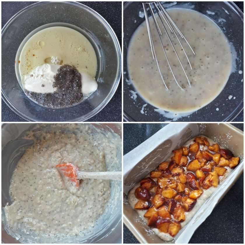- Spread half of the batter into prepared loaf pan. Spoon the peaches (and any juices) evenly on top, spread remaining batter evenly on top.