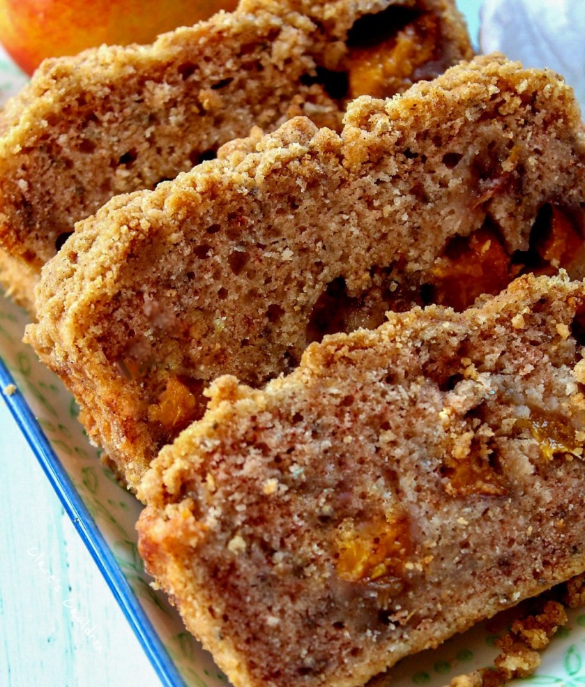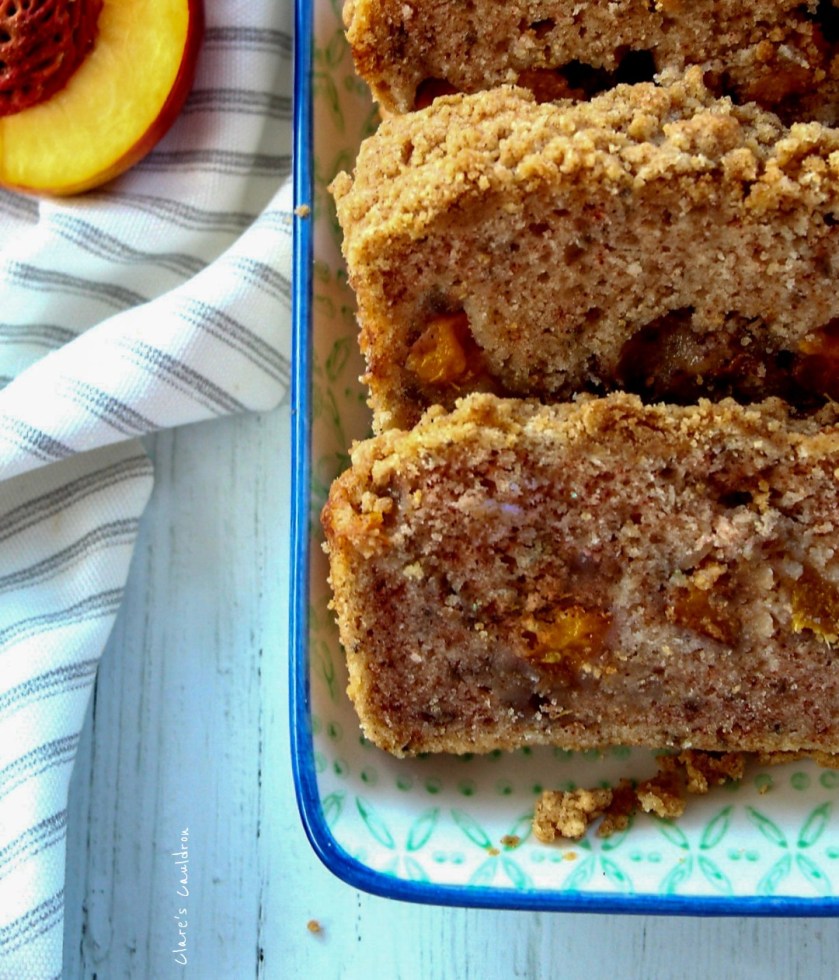 A moist peach Loaf Cake that combines h a simple batter, juicy peaches, and a brown sugar crumb topping