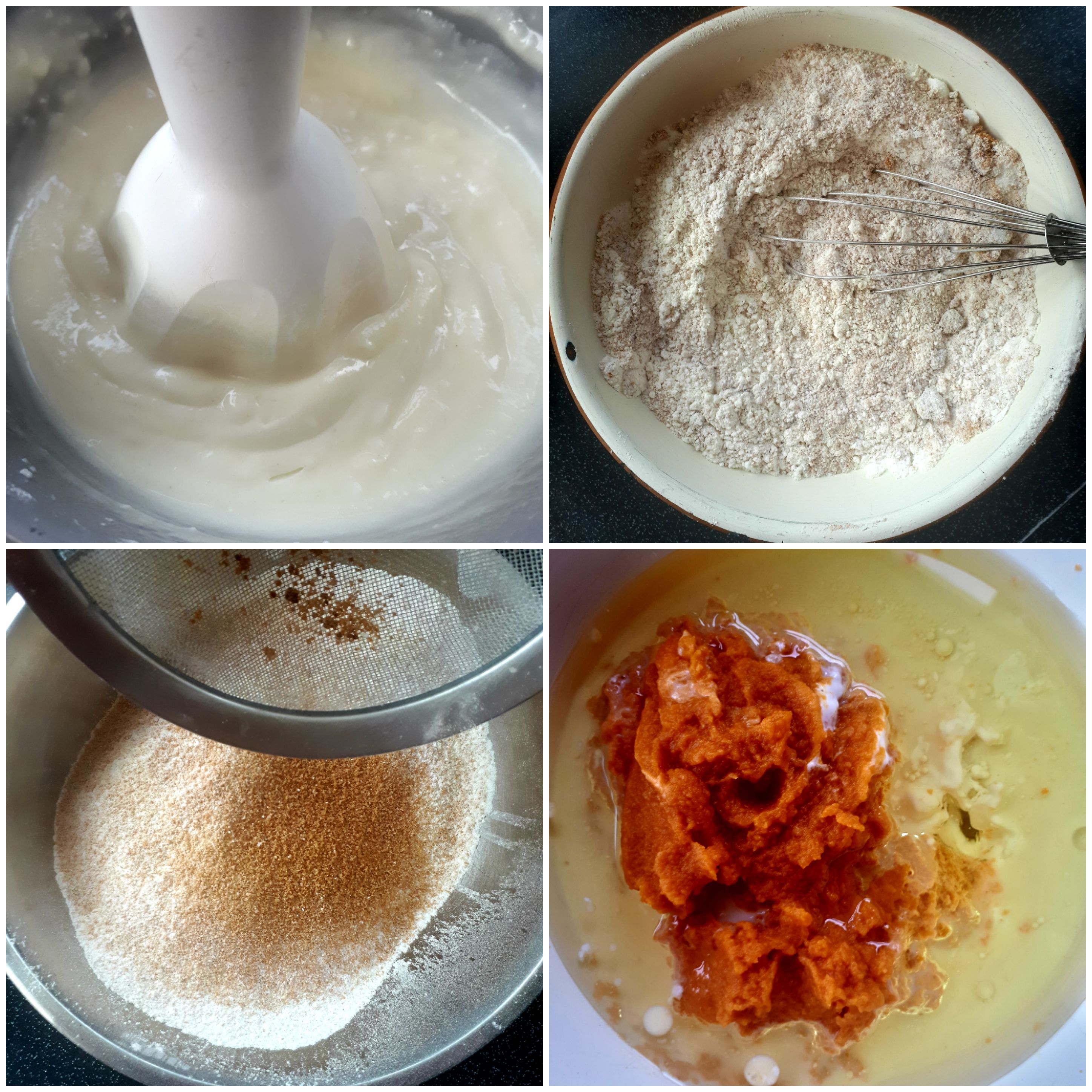 7. Add the pumpkin puree, oil, non-dairy milk, yogurt , and vanilla extract and whisk until no lumps remain