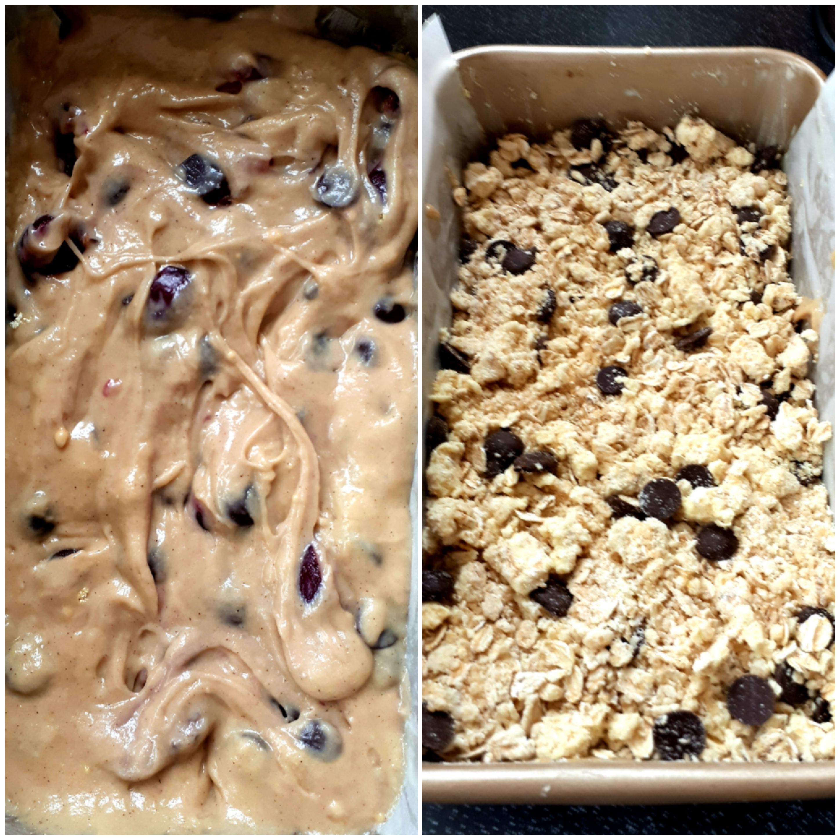 - Make the crumble by adding the Demerara Sugar , oats flour ( no xanthan needed ) and butter and rub in with your fingers until full combined and rugged looking ….like the picture below and add the 50 g chocolate chips place in the fridge