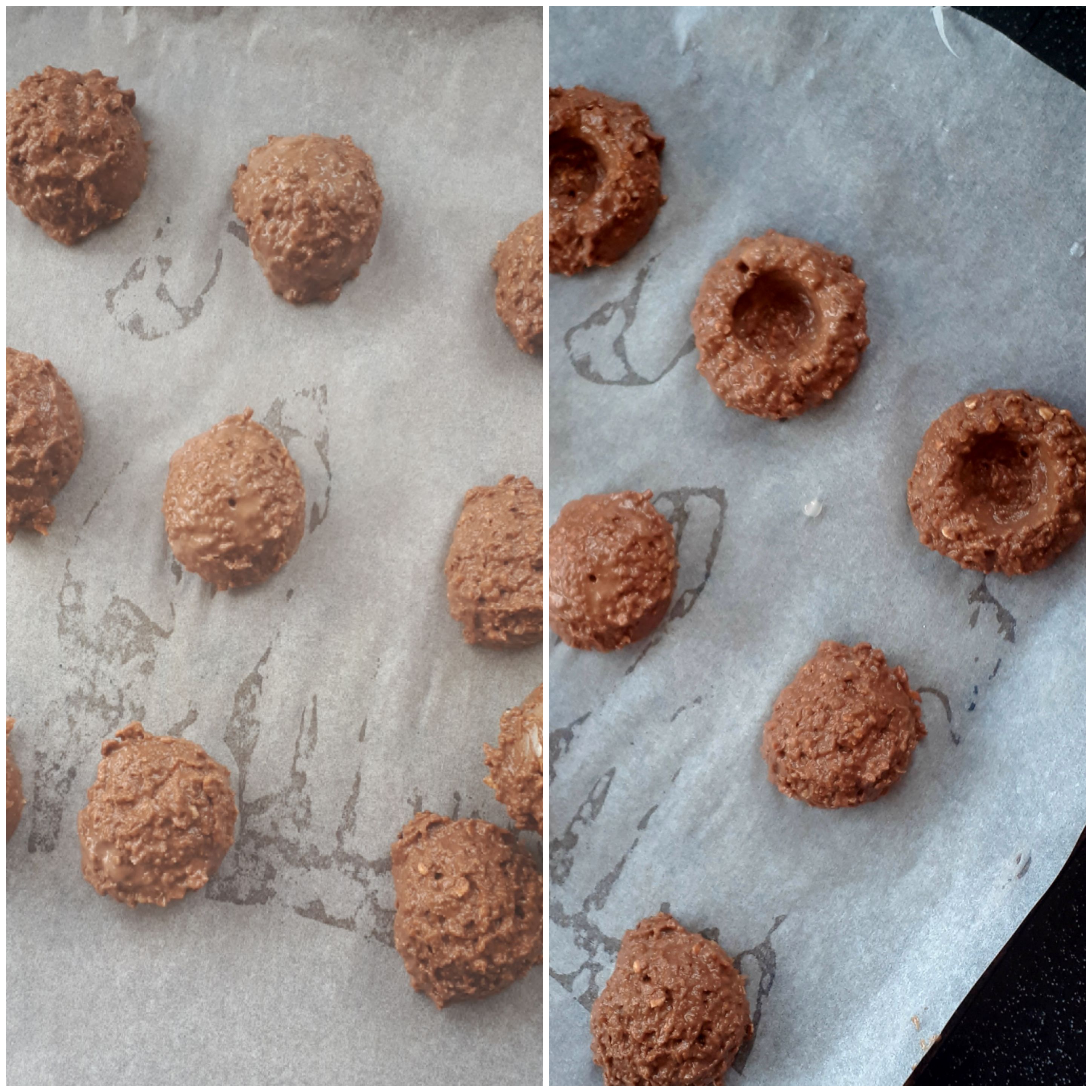 - Using a 2 tbsp cookie scoop scoop away and place on a baking tray, you leave a 2 cm space between each……you can use a measure and make balls and slightly flatten, you will need damp hands though the dough is sticky so be near the sink
