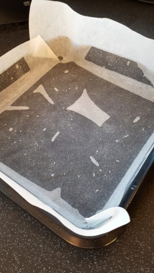 - Grease and line with baking parchment an 8′ ( 20 cm ) square Cake Tin making sure you leave 2 in proud of the top ( or a deep tin if you have one !! )