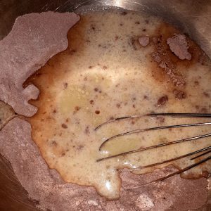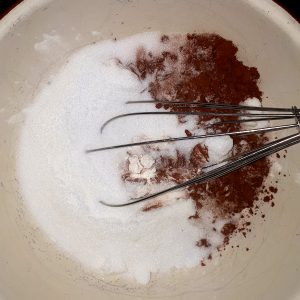 - Add the flour blend , xanthan if using , bi carb , sugar and cocao to a medium bowl and whisk together